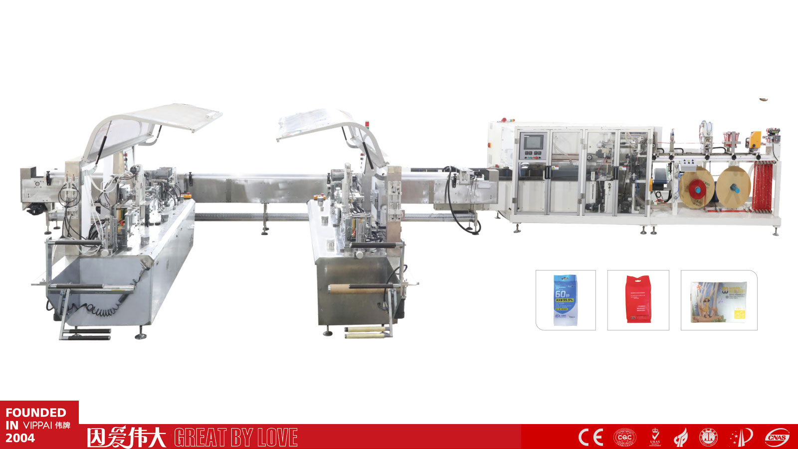 VPD250+VPD900M全自动湿巾套袋机连线 根据客户的要求,设计全自动湿巾包装机跟装盒机或套袋机连线